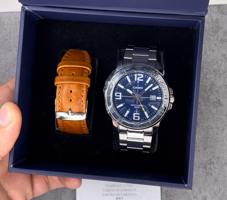پک کاسیو کادویی مردانه vd01dبا بند چرم یدک عسلی